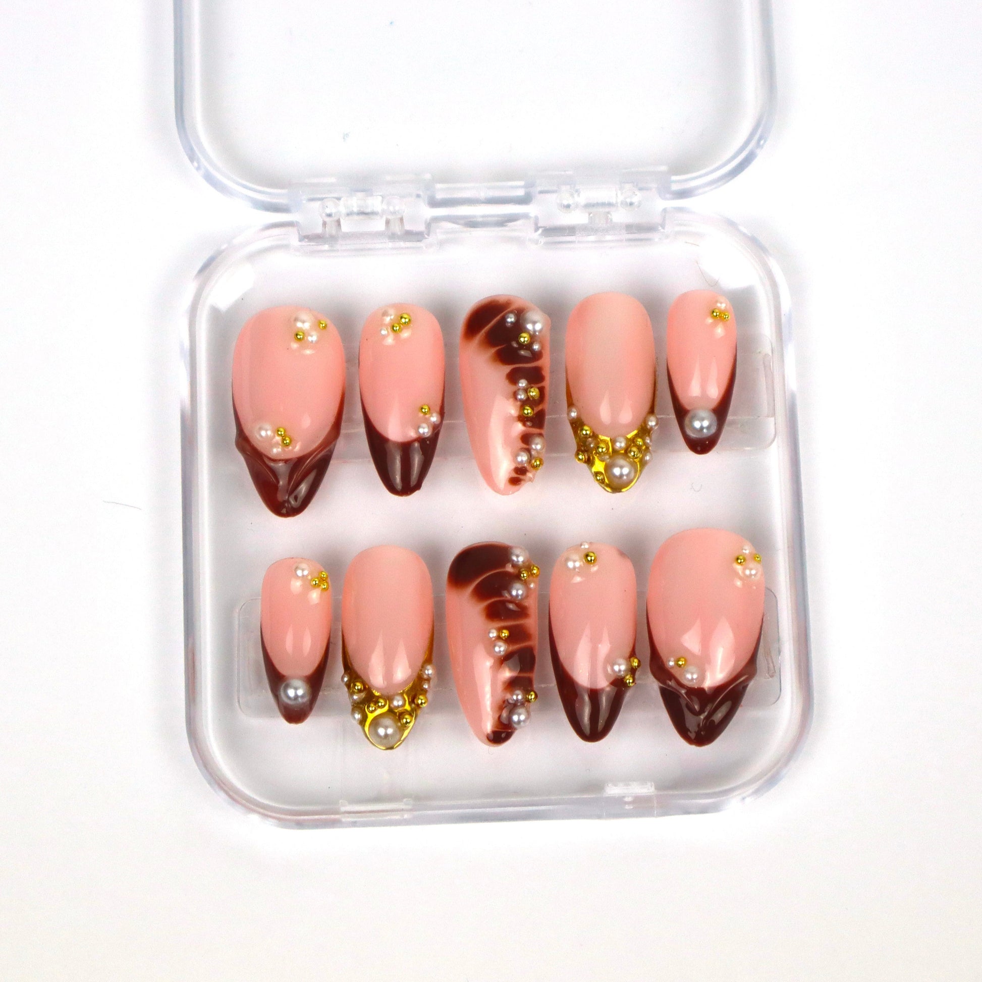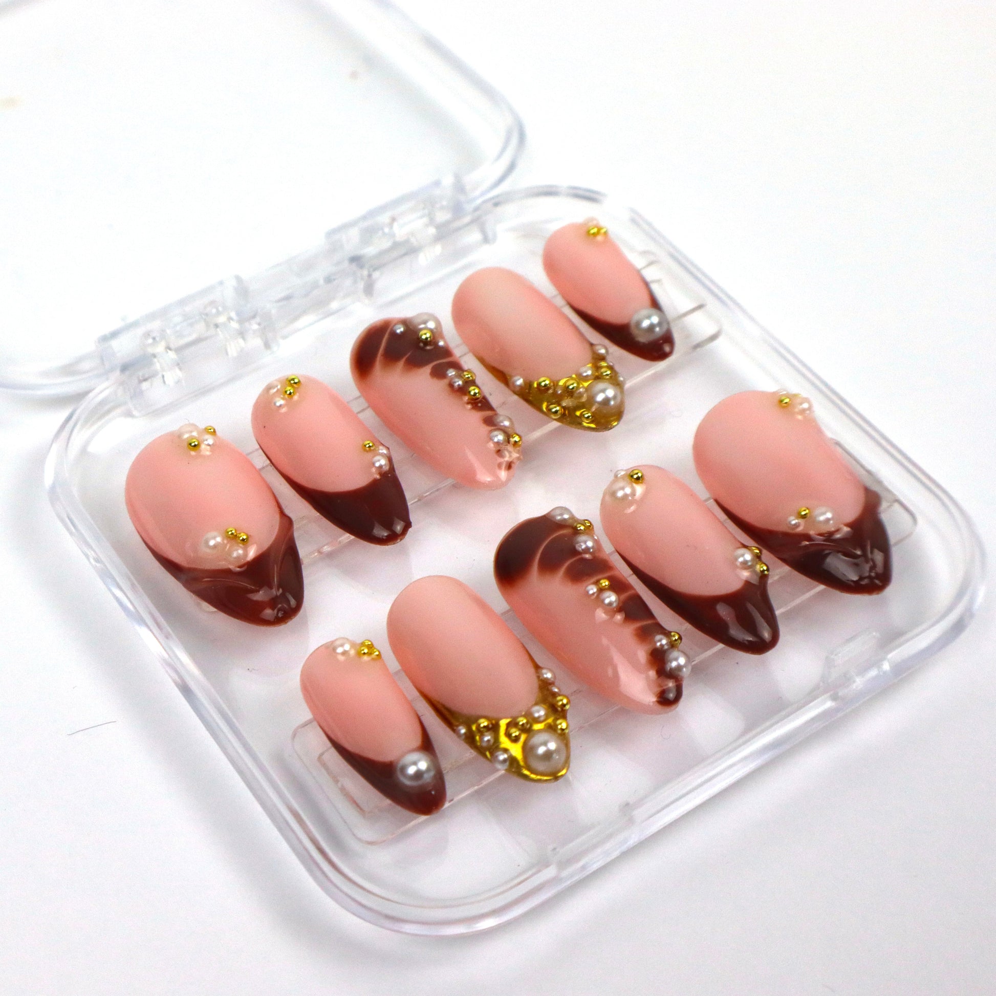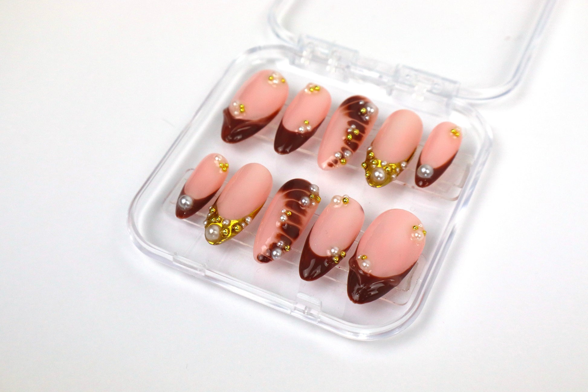 Un look audacieux et chic ! Ce set allie une french chocolat brillante à des perles et strass dorés pour un effet bijou. Le contraste entre la douceur du nude et l’intensité des détails apporte une allure luxueuse et affirmée.