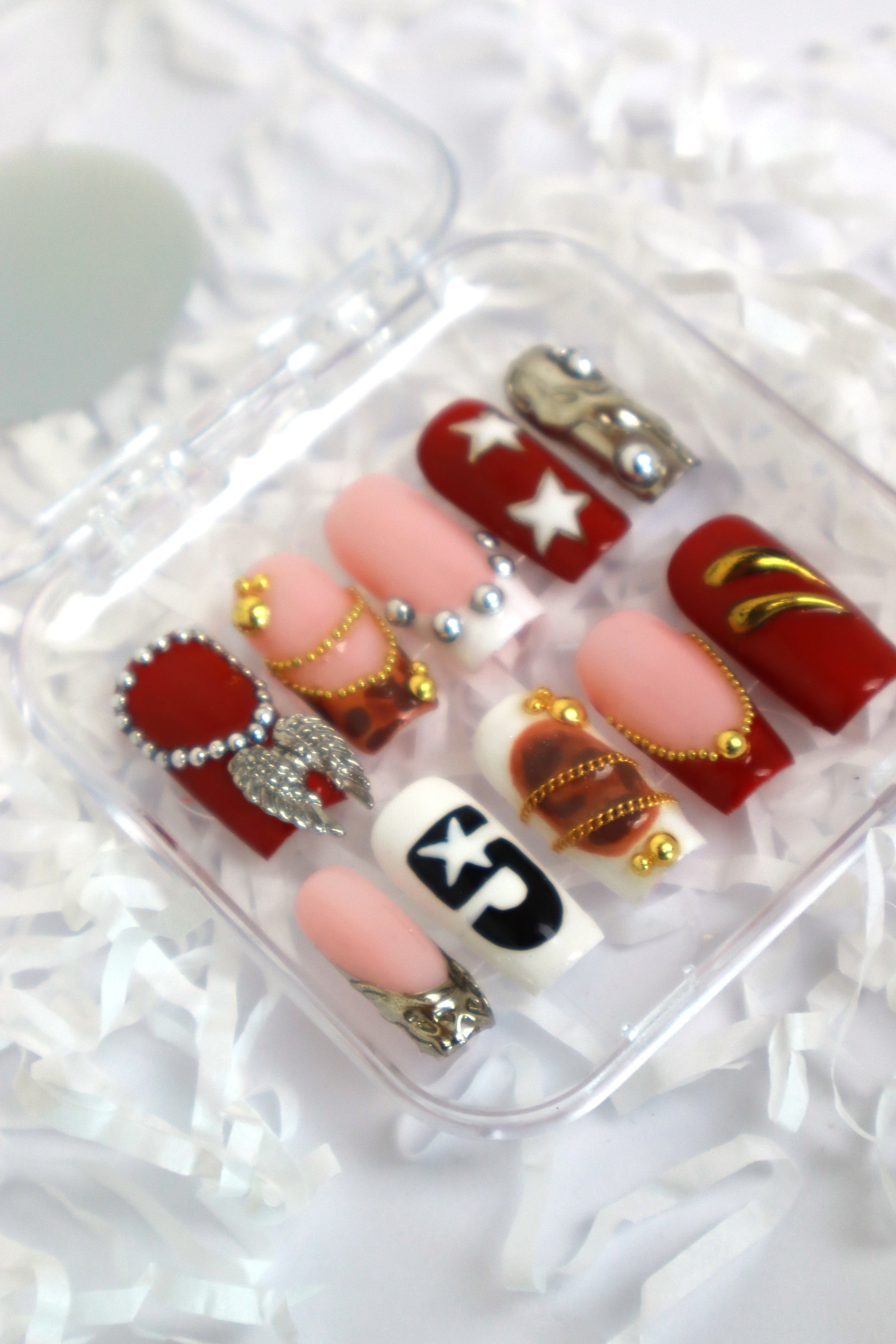 Entrez dans l'univers du luxe avec le set Haute Couture Mix, un véritable écrin de style par Nails by Swann. Chaque ongle est une pièce de collection, mélangeant des bases nude, blanches et un rouge écarlate profond. Ce kit est richement orné de bijoux 3D et de détails métalliques spectaculaires : chaînes dorées texturées, strass rubis éblouissants, étoiles blanches contrastantes, et des accents argentés sculpturaux. Ces faux ongles carrés longs garantissent une pose facile et un effet manucure de salon immédiat. Idéal pour les événements spéciaux où vous souhaitez que vos mains soient la star.