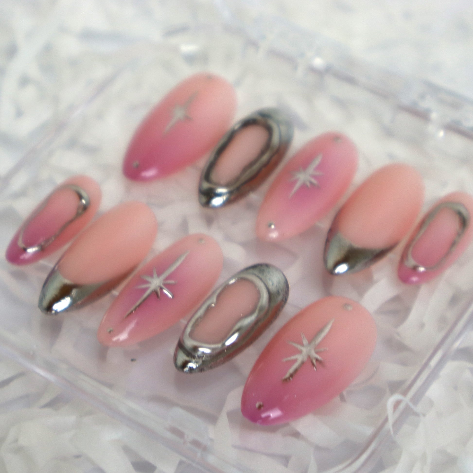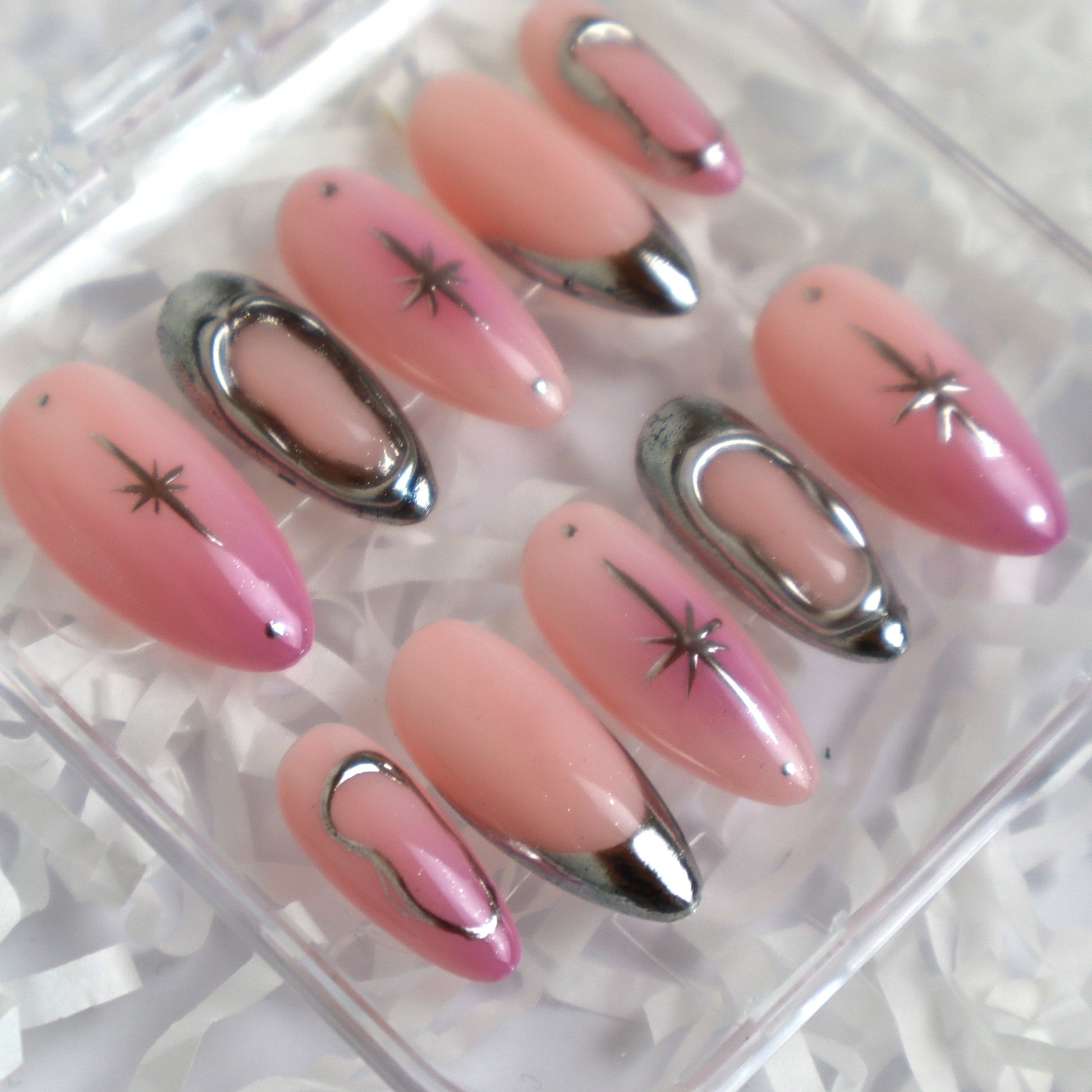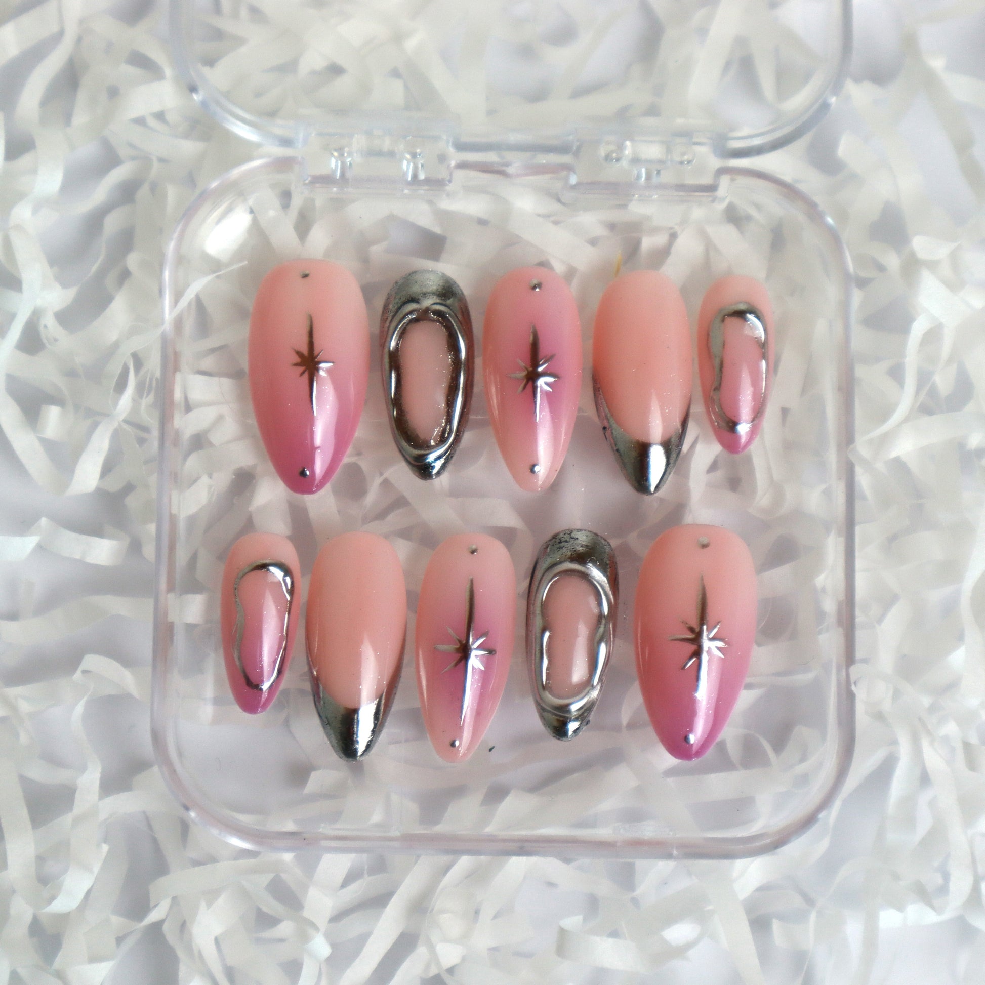 Laissez-vous séduire par l'éclat céleste du set Pink Nova de Nails by Swann. Ces faux ongles amande longs capturent la lumière avec leur sublime dégradé ombré rose poudré vers un rose plus profond (baby boomer pink). La magie opère grâce à l'effet chrome liquide argenté qui recouvre élégamment la pointe de l'ongle et crée des contours hypnotiques en relief sur deux doigts. Chaque ongle est orné d'un éclat d'étoile discret ou d'un petit strass pour une touche cosmique et futuriste. Ces press-ons réutilisables sont l'incarnation du style Y2K et métallique ultra-tendance.